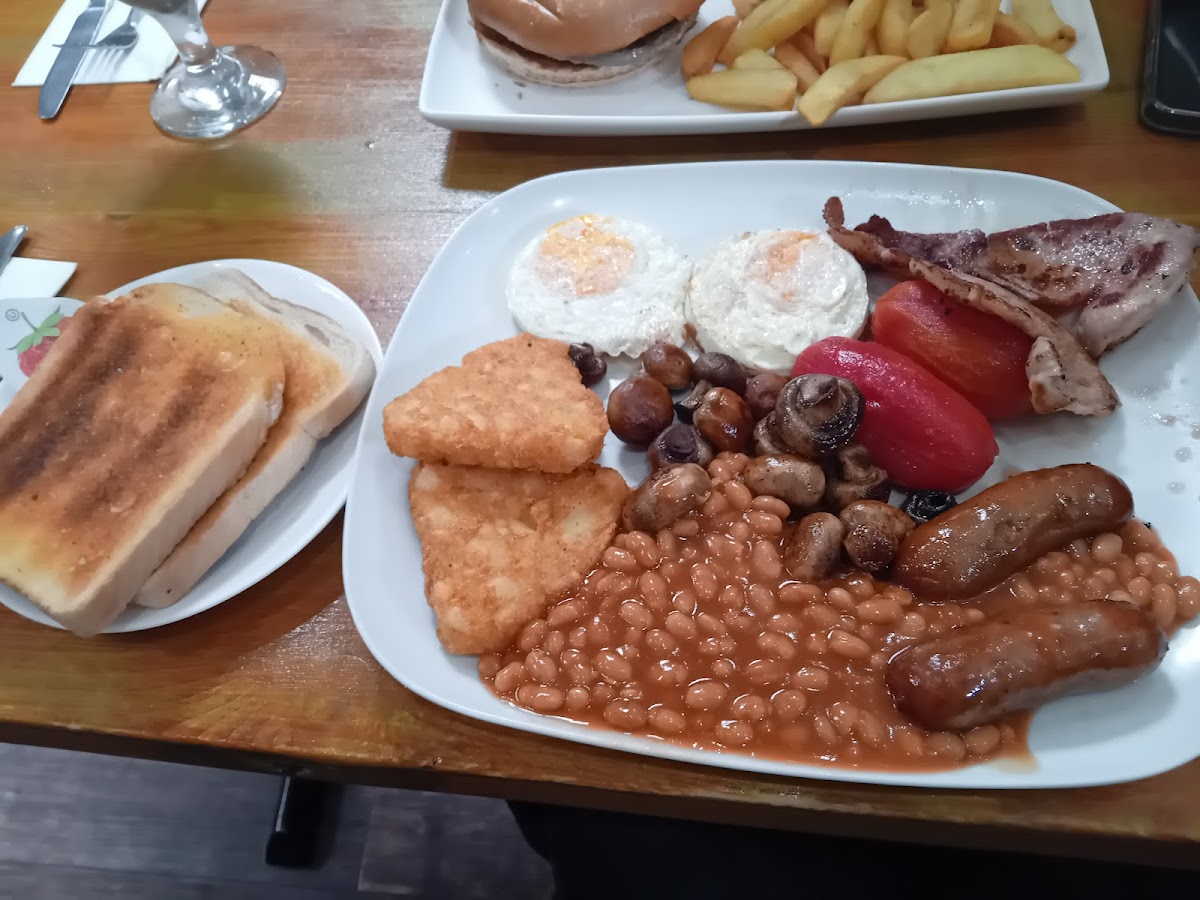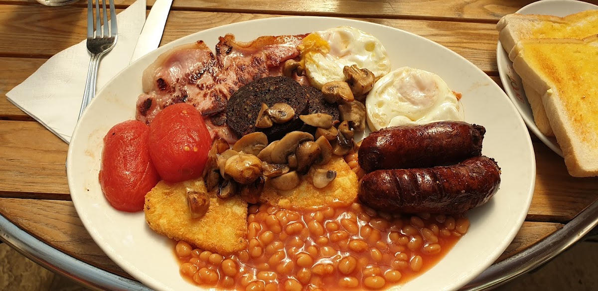 Start your day with a Full English Breakfast that will leave you feeling satisfied and energized. The plate includes two sausages, two pieces of crispy bacon, hash browns, baked beans, a fried egg, and toast with jam. It's a hearty option that combines all the classic breakfast staples in one fulfilling meal.